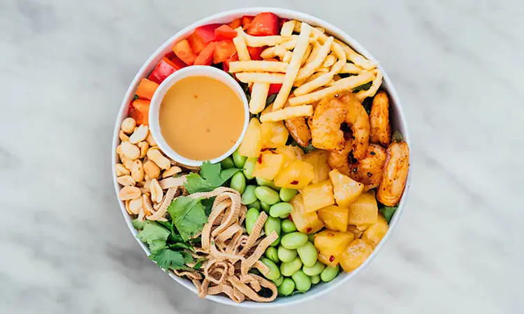 sweet chilli shrimp, tofu noodles, wonton, peanuts, chilli pineapple salsa, green onion, red pepper, edamame, mixed greens, cilantro