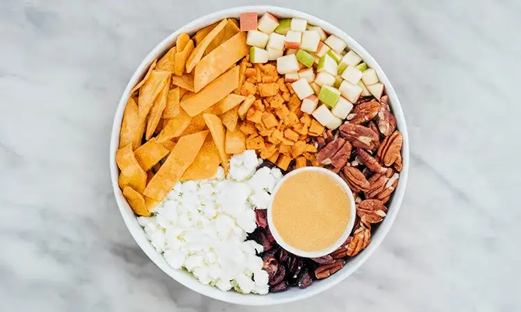 goat cheese, sweet potatoes, pecans, pita chips, apples, dried cranberries, mixed greens, romaine