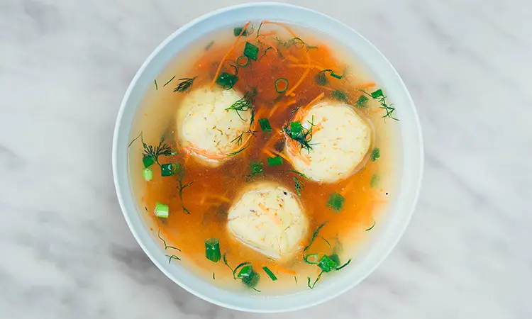 a traditional Jewish comfort food: delicious chicken broth, full of matzah balls, carrots, celery, onions and fresh dill