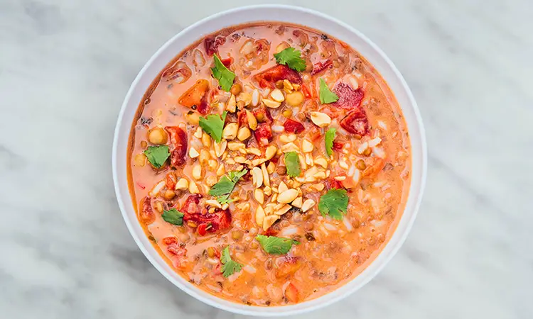 this filling soup is a vegan’s dream: veggie broth infused with rich peanut butter, veggies, brown rice, and lentils. Garnished with chopped peanuts and fresh cilantro