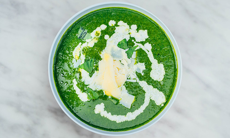 vegetable broth, broccoli, cauliflower, leeks, onions, spinach, cream, basil, lemon zest, salt, pepper
